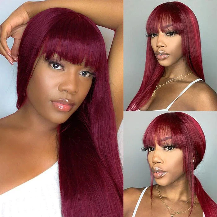Burgundy 99J Silk Straight Human Hair Wig With Bangs Glueless Top 2×4 Lace Wig Fringe Style