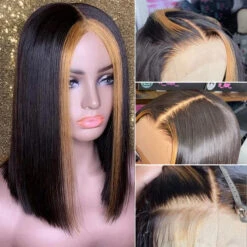 Straight Short Bob 13×4 Lace Font Wig With Blonde Highlights Streaks In Front Bob Wigs