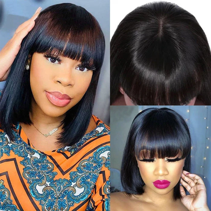 Short Bob Straight Wig With Bangs Glueless None Lace Full Machinemade Human Hair Wigs Quick Install
