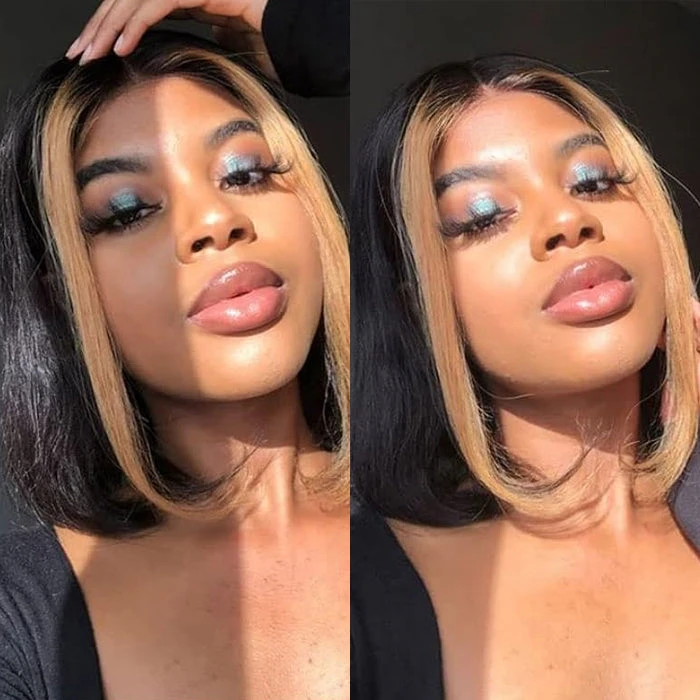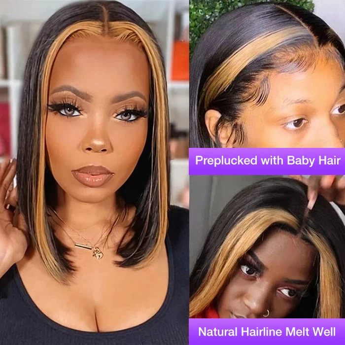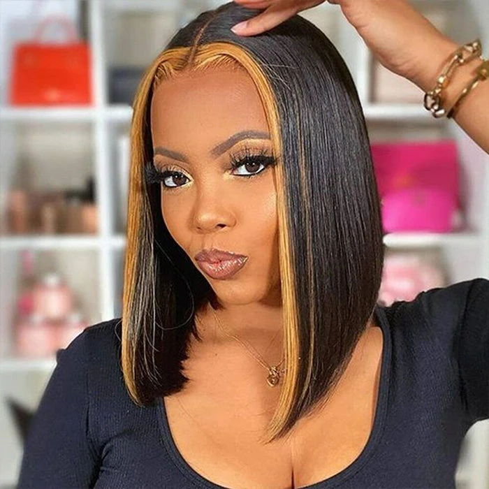 Straight Short Bob 13×4 Lace Font Wig With Blonde Highlights Streaks In Front Bob Wigs